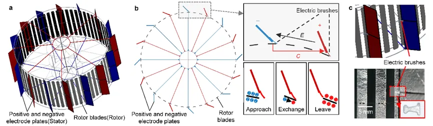 靜電發(fā)動(dòng)機(jī)的核心是靜電電機(jī),它是一種依靠靜子和轉(zhuǎn)子間的庫(kù)侖力(Coulomb force)來(lái)產(chǎn)生連續(xù)旋轉(zhuǎn)運(yùn)動(dòng)的新型微型電機(jī),具備結(jié)構(gòu)簡(jiǎn)單和無(wú)需繞組的優(yōu)勢(shì),其高電壓(千伏級(jí))、低電流(微安級(jí))的工作特性也使其在工作過(guò)程中發(fā)熱少且無(wú)明顯紅外特征。相比傳統(tǒng)電磁電機(jī),靜電電機(jī)表現(xiàn)出了顛覆式的效率和功耗特性,在小質(zhì)量(5克以內(nèi))情況下,其能量轉(zhuǎn)化效率可達(dá)傳統(tǒng)電磁電機(jī)的10倍以上,產(chǎn)生相同升力所需功耗僅為電磁電機(jī)的1/10以內(nèi),因此即便采用小尺寸太陽(yáng)能電池,也可以為微型飛行器提供飛行所需功率。