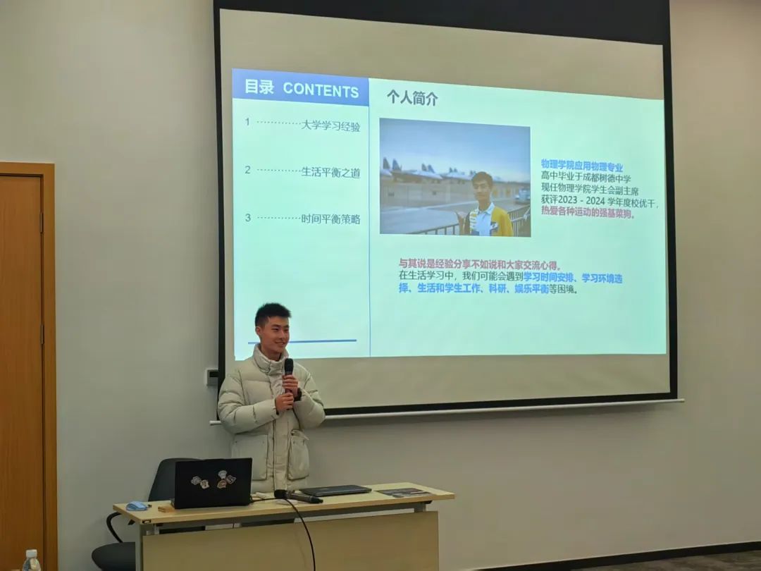 來(lái)自物理學(xué)院2023級(jí)應(yīng)用物理學(xué)強(qiáng)基計(jì)劃的易睿誠(chéng),向大家介紹了學(xué)習(xí)方法和生活平衡之道。他總結(jié)出“沒(méi)有最好的(環(huán)境、資源),只有最適合自己的”的規(guī)律。面對(duì)大學(xué)學(xué)習(xí),他強(qiáng)調(diào)首先要有自信,從心態(tài)到學(xué)習(xí)方法都要有全方面的自信。其次,應(yīng)轉(zhuǎn)變應(yīng)試思維模式以適應(yīng)新的環(huán)境,我們要善用學(xué)校提供的慕課平臺(tái)、學(xué)術(shù)數(shù)據(jù)庫(kù)等資源建構(gòu)立體化學(xué)習(xí)體系。在生活平衡之道中,易學(xué)長(zhǎng)介紹了兩個(gè)中心思想:規(guī)律性和優(yōu)先級(jí)。規(guī)律性本質(zhì)是“用確定性對(duì)抗不確定性”,在動(dòng)態(tài)環(huán)境中構(gòu)建個(gè)人的“時(shí)間護(hù)城河”。優(yōu)先級(jí)管理的本質(zhì)是資源分配策略,需以價(jià)值為導(dǎo)向進(jìn)行取舍。利用“四象限法則”,定期復(fù)盤,最大限度實(shí)現(xiàn)自己的所有需求。規(guī)律性與優(yōu)先級(jí)并非孤立存在。規(guī)律性為優(yōu)先級(jí)提供執(zhí)行載體,優(yōu)先級(jí)為規(guī)律性注入方向性,二者結(jié)合的關(guān)鍵在于動(dòng)態(tài)平衡。