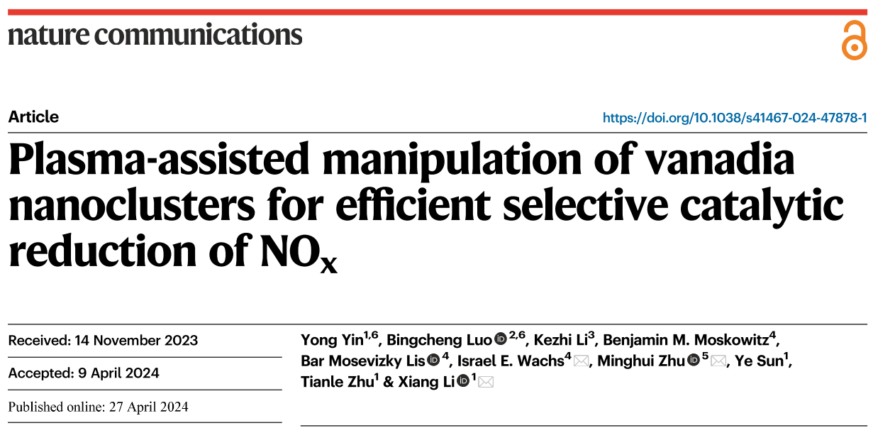 近日,北京航空航天大學能源與動力工程學院李想副教授團隊與合作者在固定源煙氣污染物控制領域取得重要進展。選擇性催化還原是最廣泛應用的煙氣脫硝技術,然而傳統(tǒng)釩基催化劑反應溫度高難以適用于鋼鐵、水泥等工業(yè)窯爐的脫硝應用。如何通過活性位點精準調控強化釩基催化劑脫硝性能一直是該領域的挑戰(zhàn)。團隊基于H2低溫等離子體表面處理,實現(xiàn)了低釩含量下高活性亞納米釩氧團簇的快速合成,將脫硝效率提升十倍以上,并發(fā)現(xiàn)了吸附橋式硝酸鹽參與氨活化的新反應路徑,為固定源煙氣脫硝提供了新思路。2024年4月27日,相關研究成果以“Plasma-assisted manipulation of vanadia nanoclusters for efficient selective catalytic reduction of NOx”為題在線發(fā)表于《自然·通訊》(Nature Communications)雜志。